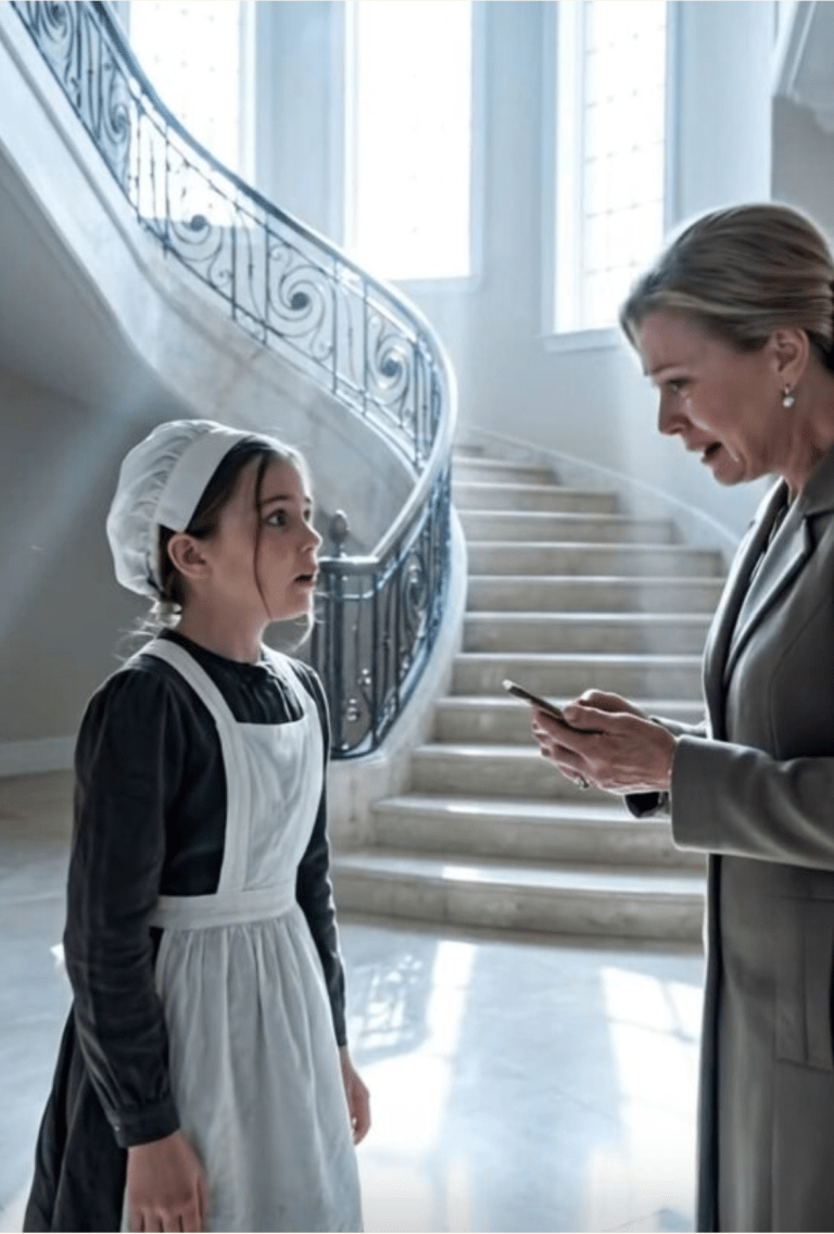 Hon gick långsamt genom hallen, en tung tvättkorg tryckt mot höften. Håret var slarvigt uppsatt. Kläderna var matta, slitna, fläckiga. Hennes händer — grova, spruckna, märkta av år av hårt arbete och hett vatten.