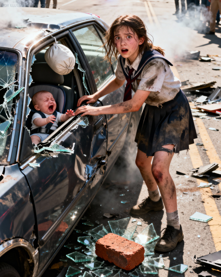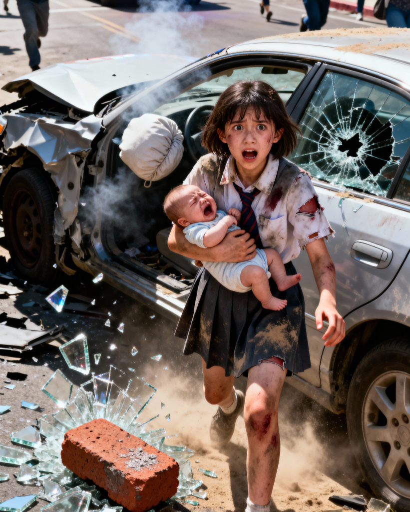 Sedan tillbaka på barnet.Beslutet tog mindre än ett hjärtslag.Hon tog upp en trasig tegelsten från trottoarkanten, händerna skakade så kraftigt att hon nästan tappade den.”Förlåt,” viskade hon — till bilen, till sin framtid, till allt hon kunde förlora.