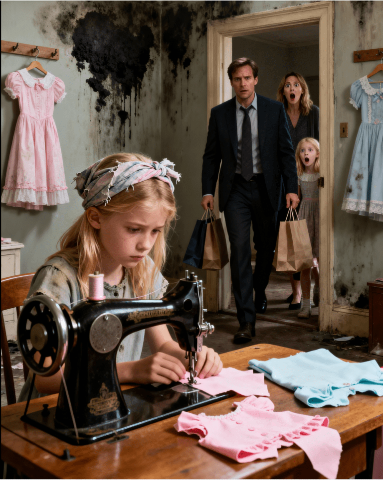 Hennes fingrar rörde sig med försiktig precision och förde en remsa urblekt blått tyg under nålen på en sliten symaskin. Varje stygn var medvetet, hennes käkar så hårt sammanbitna att det såg ut som om världens tyngd vilade på hennes smala axlar.