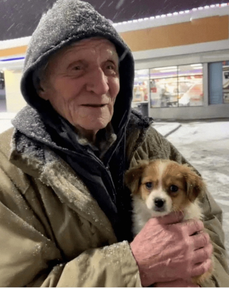 Snö hade samlats på hans axlar. Bredvid honom satt en liten rödvit hund med huvudet vilande på hans knä. Ingen skällning, inget gnäll – bara tålmodigt väntande.Innan jag hann reagera släppte Alisa min hand och sprang mot djuret.