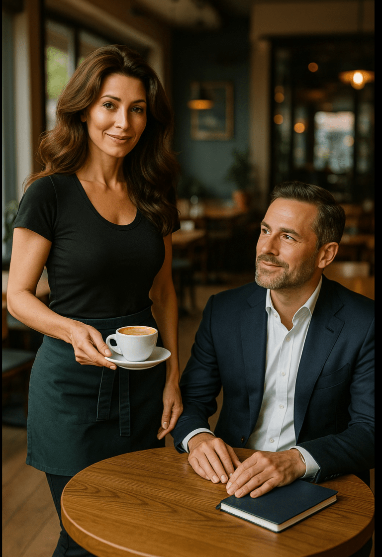 – Vänta… du behöver inte gå, sa hon tyst men bestämt. Här finns inga regler som säger att man inte kan sitta… bara så. Strunta i honom.Hon kastade en snabb blick mot baristan, vars ögon glittrade spydigt.