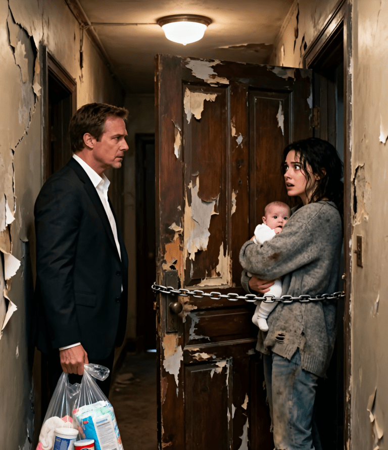 Tystnad.Sedan öppnades dörren på glänt.Marlene stod där, utmattad och misstänksam, med Juniper tätt mot axeln.”Jag är inte här för att göra dig illa”, sa han mjukt.Dörren öppnades helt.Lägenheten var nästan tom – men skinande ren. Den tomma burken på bänken kändes som en tyst anklagelse.