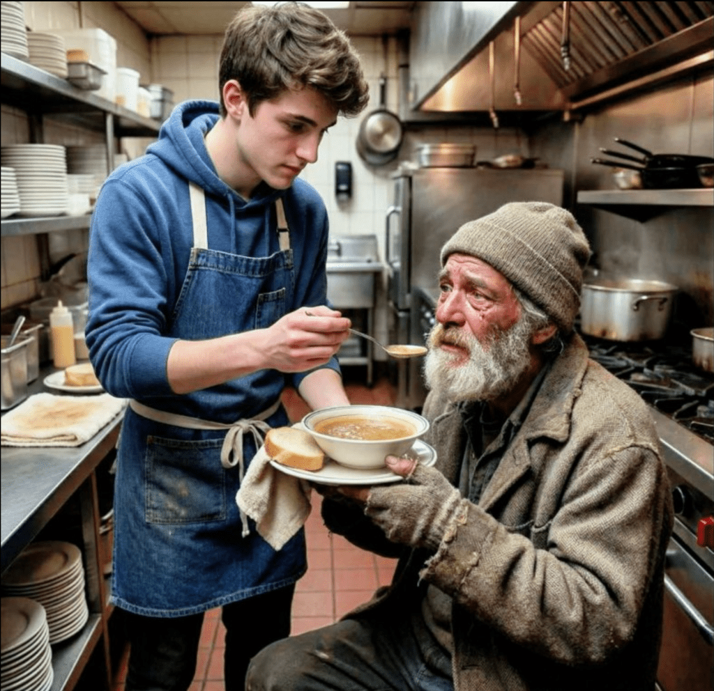 – Du tog in en hemlös i min restaurang?! Är du galen?!– Snälla… han skulle ha frusit ihjäl… försökte jag.– Jag bryr mig inte! Det här är ett företag, inte ett skydd!– Sätt honom på porten, beordrade han. Min mage sjönk ihop.