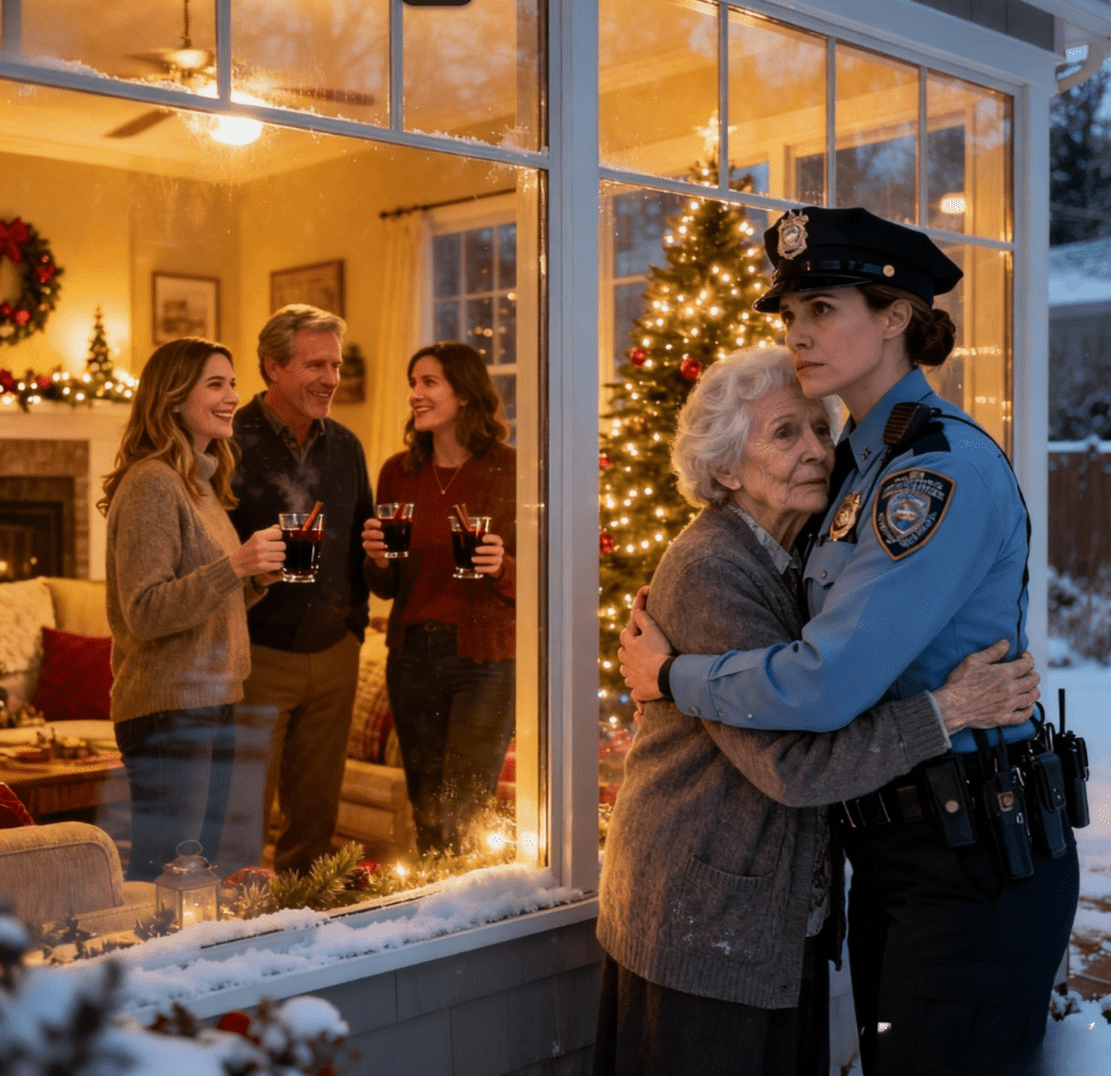 Jag mötte varje blick.Sex ord—avvägda, metalliska—skar genom luften.Skratten dog ut.Två timmar tidigare stod min patrullbil på Maple Street, motorn klickade när den svalnade. Julbelysningen sydde ihop kvarteren—plastjultomtar lutade i snön, änglar präglade gräsmattorna, barns fotavtryck som sedan länge gått in för att leka.