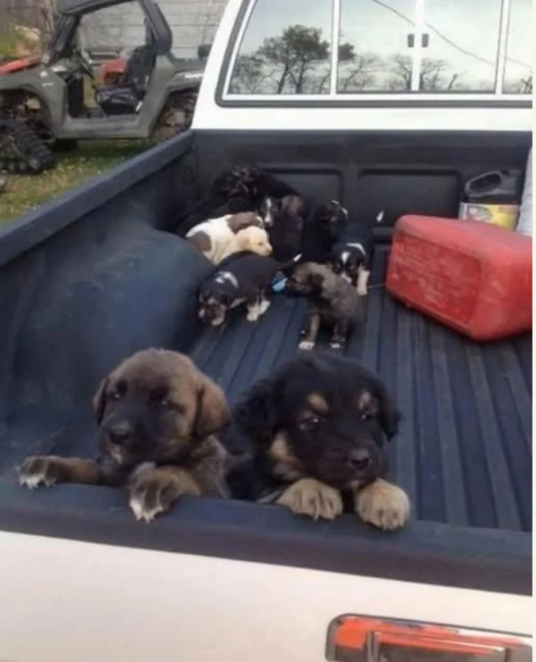 Nyfiken gick jag närmare. Jag lutade mig över flaket… och mitt hjärta stannade för ett ögonblick. Där låg en hög med små valpar, kanske bara några veckor gamla. Smutsiga, toviga och skakande, hopkrupna för att hålla värmen.