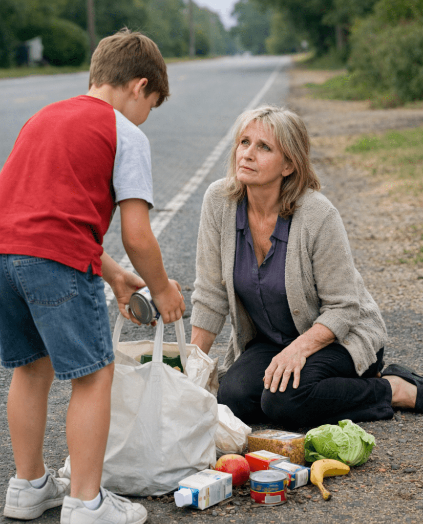 En matpåse hade gått sönder bredvid henne; ett äpple rullade långsamt nerför sluttningen. Hennes hand tryckte mot marken, axlarna skakade, inte av kyla, utan av något tyngre.– Frun? – ropade jag, med en liten, osäker röst och visste inte om jag skulle gå närmare.