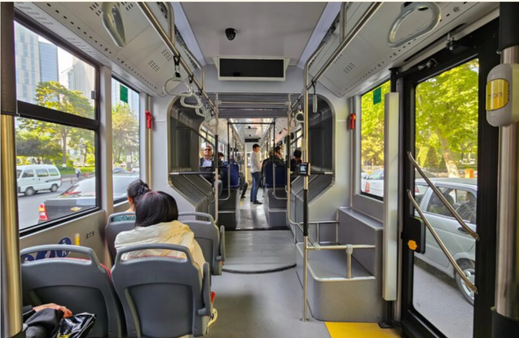 Motorbrummandet blandades med dämpade konversationer, ljudet av skosulor mot golvet och det sporadiska pipandet från stoppknapparna.