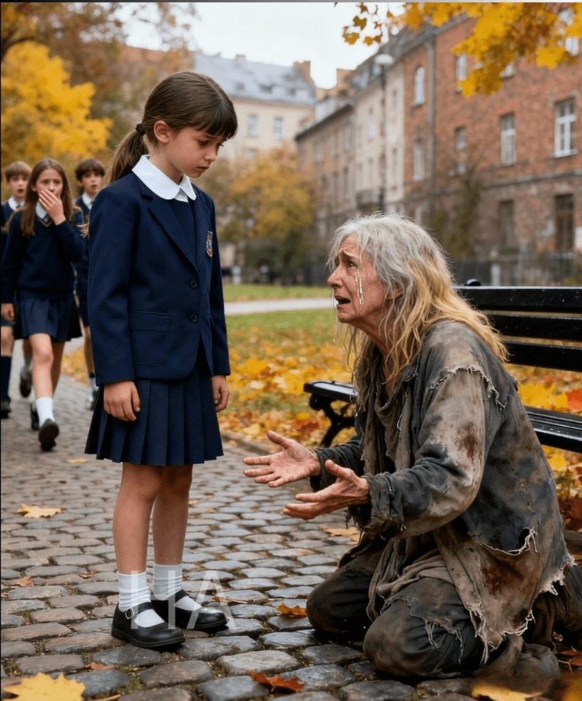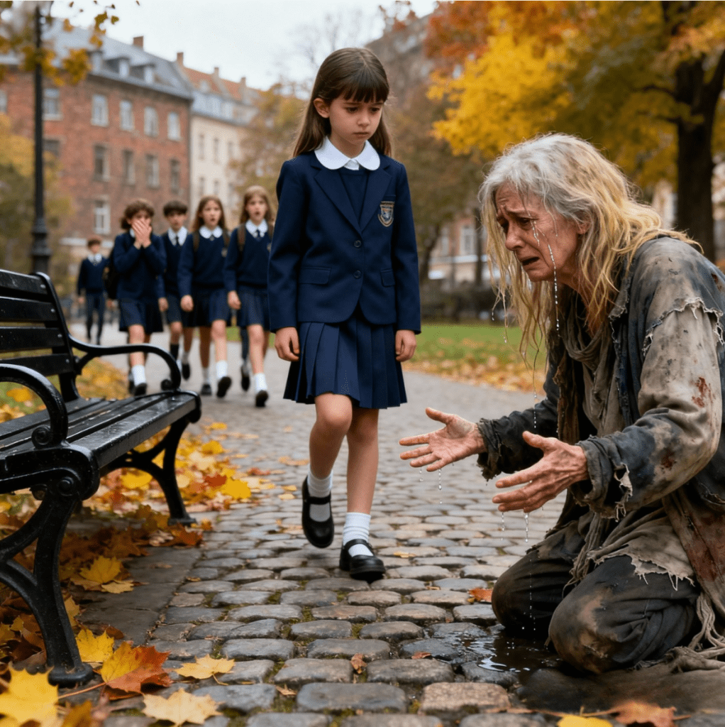 Stigen var hal, luften skarp av doften av blöta löv. Clara balanserade sin ryggsäck och en hög skolpapper när hennes anteckningsbok olyckligtvis föll i en lerpöl.Innan hon hann plocka upp den, kastade sig den hemlösa kvinnan fram.