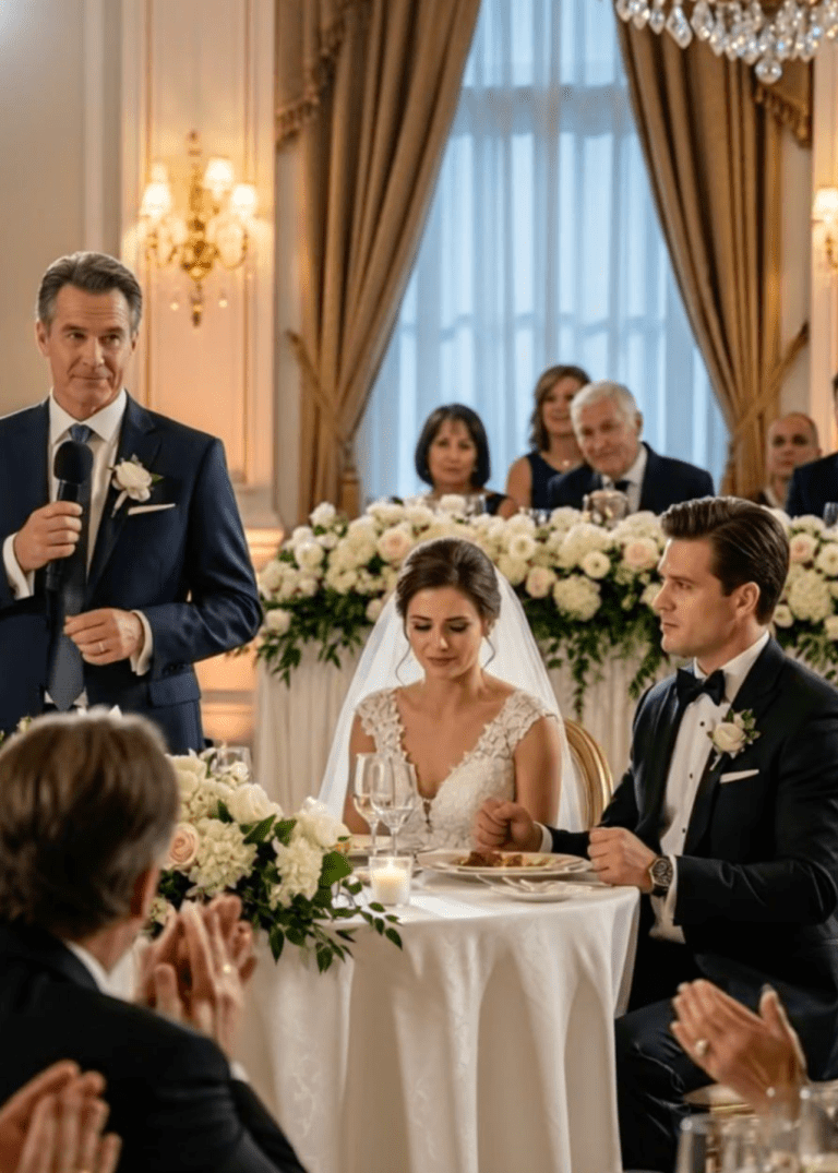”Hon förtjänar ett riktigt bröllop,” sa min pappa stolt, som om han just hade utfört en heroisk handling.Jag grät inte. Jag andades inte ens. Jag stirrade bara på min fästman.Han reste sig lugnt, tog fram sin telefon och sa med en röst som var både kall och kontrollerad: ”Ska jag berätta för dem vad jag faktiskt gör i livet?”